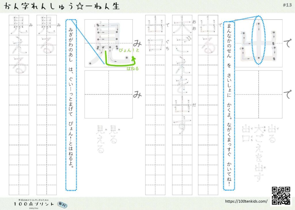 「貝」にならないようにするための、最後の「ぐいっとまげてはねる」線がポイントです。ためらわず思いっきり書けるように、一緒に練習してあげてください。