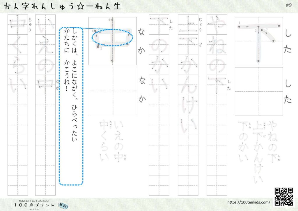 「下」という漢字の読み方・書き順・例文 2023.12.012025.10.19 「下」という漢字の読み方・書き順・例文 学習する学年 小学一年 画数 三画 部首 いち 読み方 した 一年生・二学期に読み替え ゲ 二年生・一学期に読み替え お(ろす)、お(りる) 例文 つくえの下(した) 上下(ゲ)にうごく 見(み)下(お)ろす、下(お)りる 無料プリント 「下」と「中」の練習ができるプリントです。 「下」という字も「上」と同じでいろいろな読み方が追加されていく漢字ですね! 印刷する 新しい読み方が出てきたら、それも覚える必要があるのが、漢字学習のポイントですね。 こちらは、2年生の一学期に習う新しい読み方の練習プリントです。 印刷する