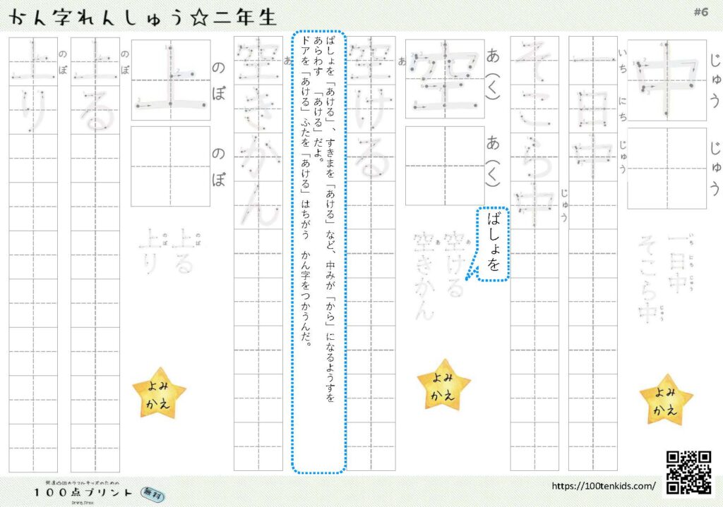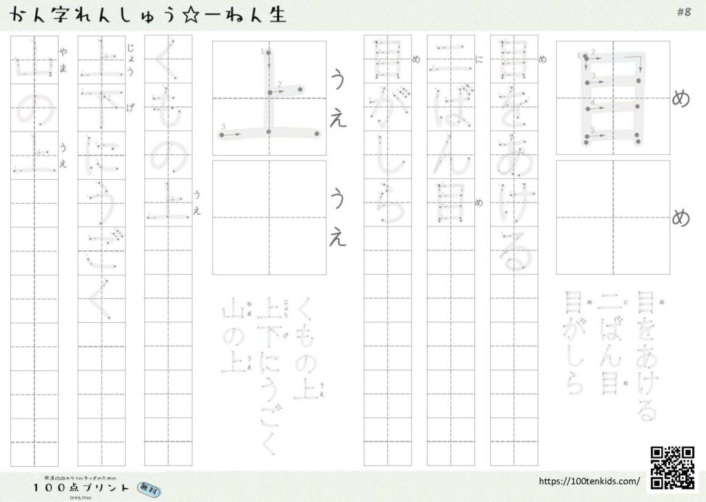 「上」という漢字の読み方・書き順・例文 2023.12.012025.10.19 「上」という漢字の読み方・書き順・例文 学習する学年 小学一年 画数 三画 部首 いち 読み方 うえ 一年生・二学期に読み替え ジョウ 二年生・一学期に読み替え のぼ(る) 例文 上(うえ)にのせる 上(ジョウ)下にうごく 上(のぼ)る 無料プリント 「目」と「上」の練習ができるプリントです。 「上」という字はいろいろな読み方が追加されていく漢字です。まずは「上」と「上(じょう)下」を覚えましょう。 印刷する 新しい読み方が出てきたら、それも覚える必要があるのが、漢字学習のポイントですね。 こちらは、2年生の一学期に習う新しい読み方の練習プリントです。 印刷する